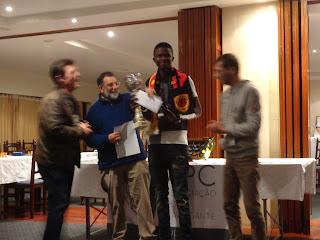 25 de Janeiro de 2016 - segunda-feira - escrito por João Lopes. Foto à esquerda, do angolano David Silva, IM, sub 18 anos, vencedor do torneio, a receber o troféu. Na foto da direita, os participantes no torneio. Fotos do site da Associação Peão Cavalgante, clube que organizou o torneio .