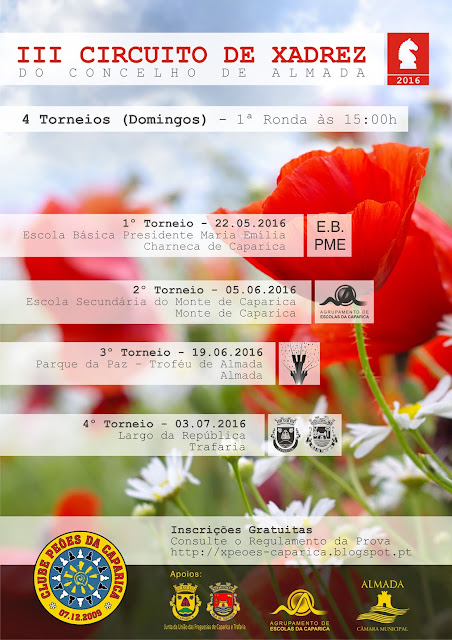 Eis alguns torneios que irão decorrer em breve. No próximo domingo, 22 de Maio de 2016, começa o III Circuito de Xadrez do Concelho de Almada, com a realização de 4 torneios, sempre ao domingo : 22 de Maio; 5 de junho, 19 de Junho e 3 de Julho. Eis alguma informação deste circuito, tirada do site do Clube Peões da Caparica.