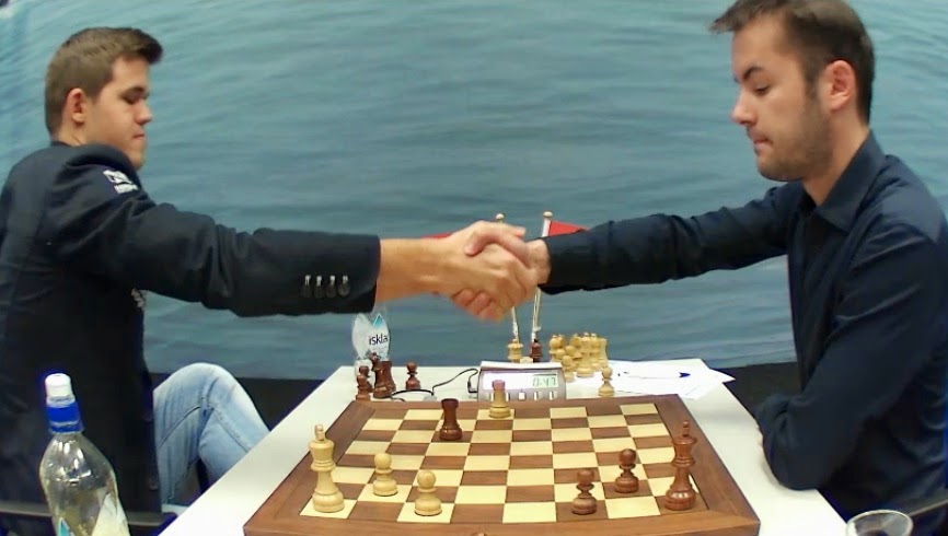 Foto de Ivan Saric,( à direita ), GM, da Croácia, no jogo do torneio Tata Steel, na Holanda, disputado em Janeiro deste ano, com o campeâo mundial, Magnus Carlsen, (à esquerda ) GM, da Noruega, que terminou empatado. Este jogador croata joga o Zadar Open 2015. Foto do site Reino de Caíssa.